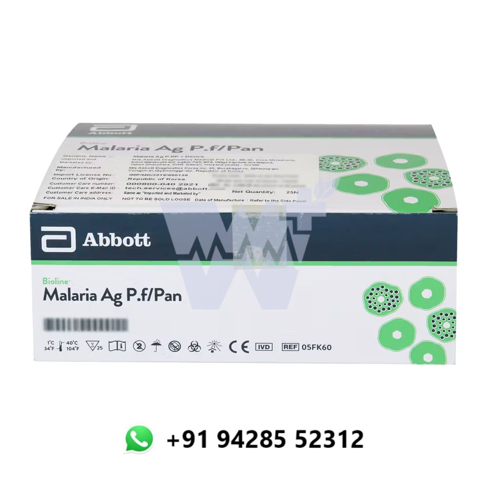 The Abbott Mal AG P.F/PAN (D) Global Malaria Rapid Card is a high-performance, immunochromatographic assay designed for the qualitative detection of Plasmodium falciparum (Pf) and pan-malarial (Pan) antigens in human whole blood. Developed for global malaria control efforts, this test enables early and accurate detection of P. falciparum and other Plasmodium species, ensuring prompt treatment and improved patient outcomes. Each kit includes 25 single-use test devices.