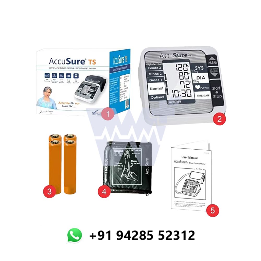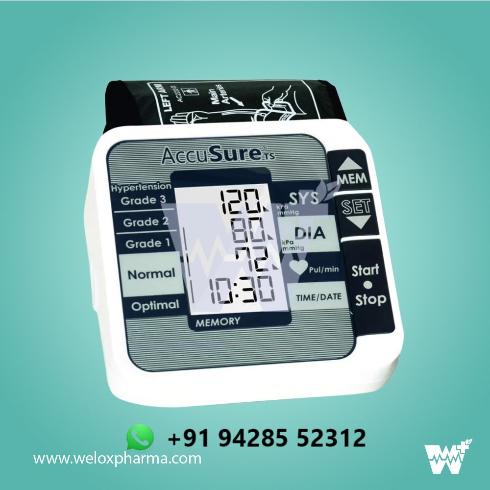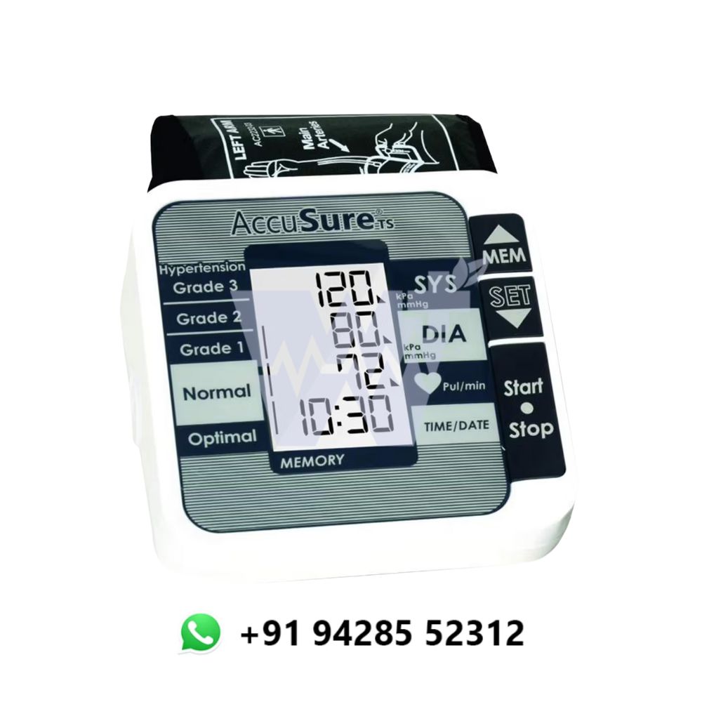 The AccuSure TS Digital Blood Pressure Machine is designed for accurate and convenient blood pressure monitoring at home or in clinical settings. Featuring advanced oscillometric technology, it provides reliable measurements of systolic, diastolic, and pulse rate with one-touch operation. The large, backlit LCD display ensures easy reading of results, even in low light conditions. Its comfortable, adjustable cuff accommodates a range of arm sizes, ensuring a secure fit for all users. The device also includes memory storage, allowing you to track your blood pressure trends over time, and offers an irregular heartbeat detection function for early identification of potential health issues.