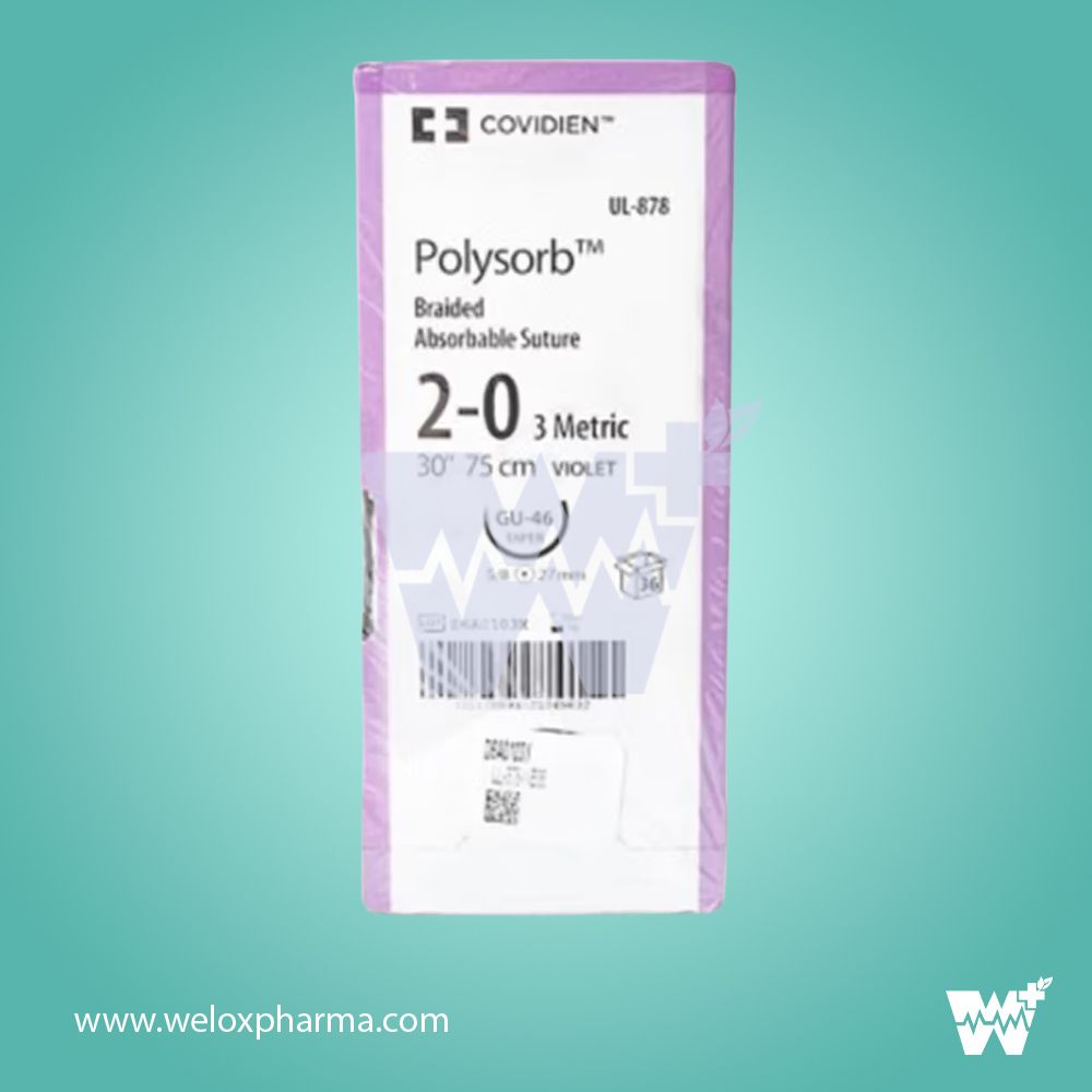Covidien Polysorb 2-0 is a braided, absorbable synthetic suture composed of lactomer glycolide/lactide copolymer, engineered for high tensile strength, precise handling, and predictable absorption. Its coated surface allows smooth tissue passage and secure knot tying, making it an optimal choice for soft tissue approximation and ligation across general, gynecologic, orthopedic, and plastic surgeries.