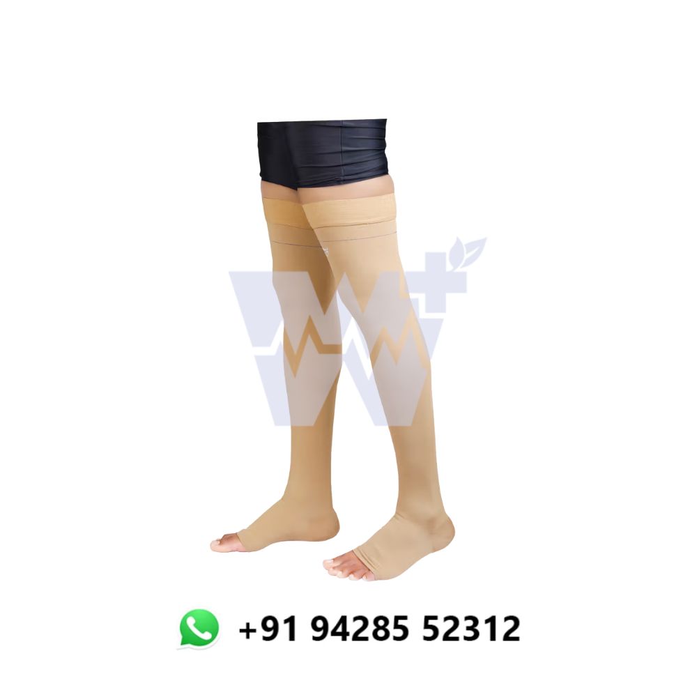 • Graduated Compression: Enhances circulation with higher pressure at the ankle, gradually decreasing up to the groin.