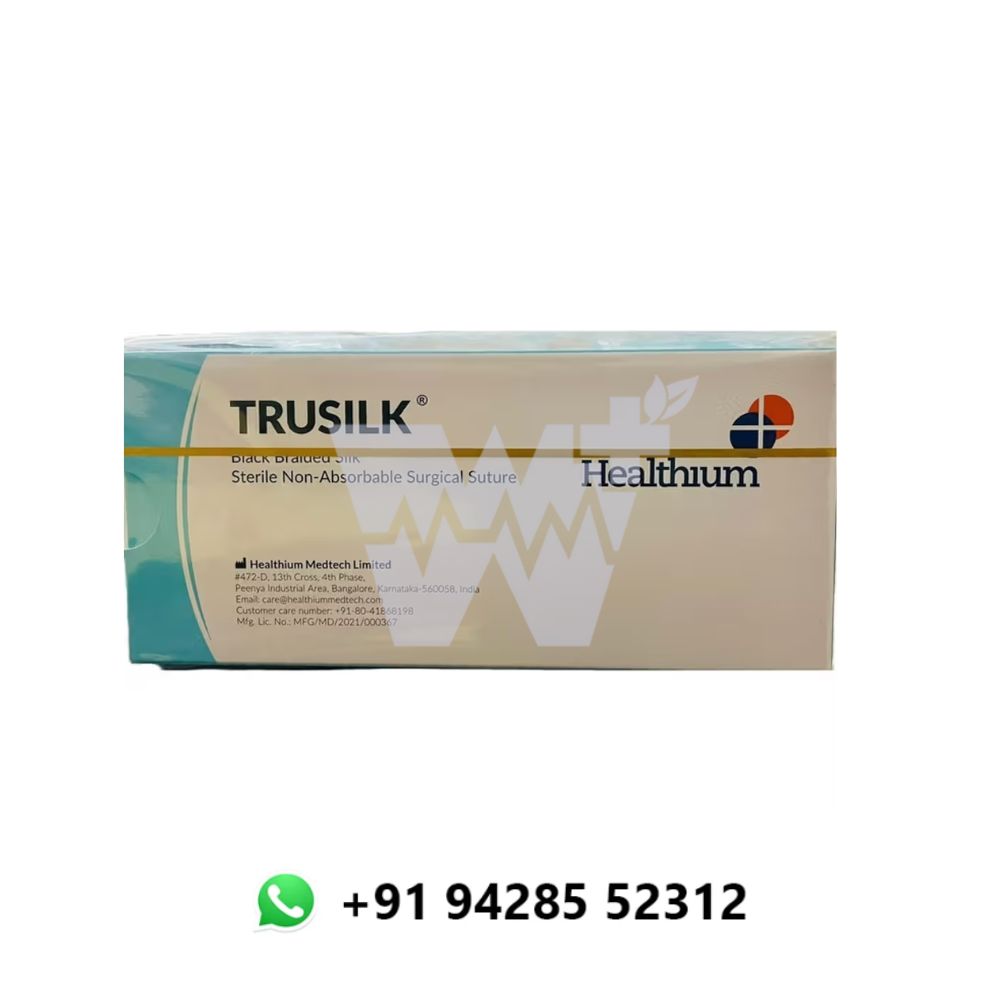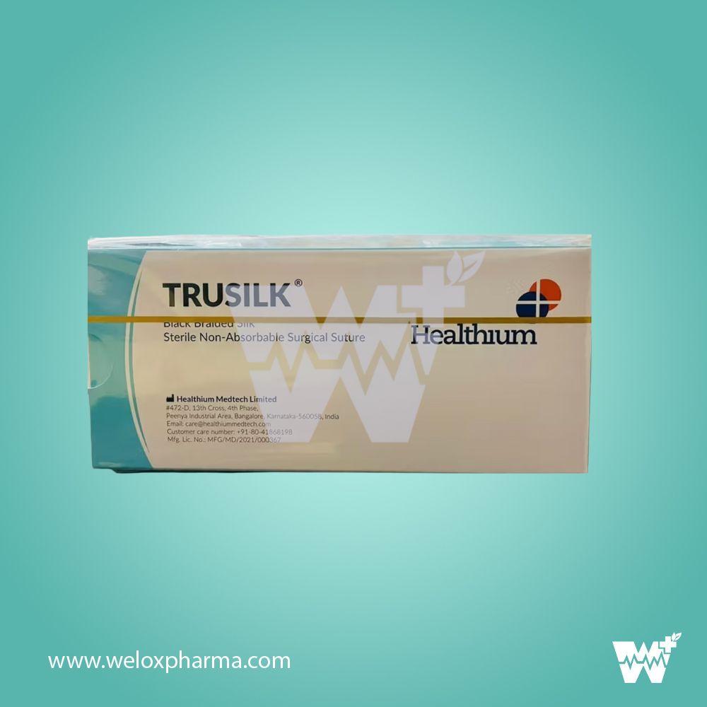 Healthium Trusilk is a non-absorbable, braided silk suture designed for general surgical use requiring precise soft tissue approximation and ligation. Made from natural silk fibers coated with a silicone or wax-based compound, Trusilk offers superior handling, excellent knot security, and smooth tissue passage. Though not absorbable, it gradually loses tensile strength over time due to proteolytic enzymatic degradation. It is commonly used in general, dental, ophthalmic, and skin closure procedures.