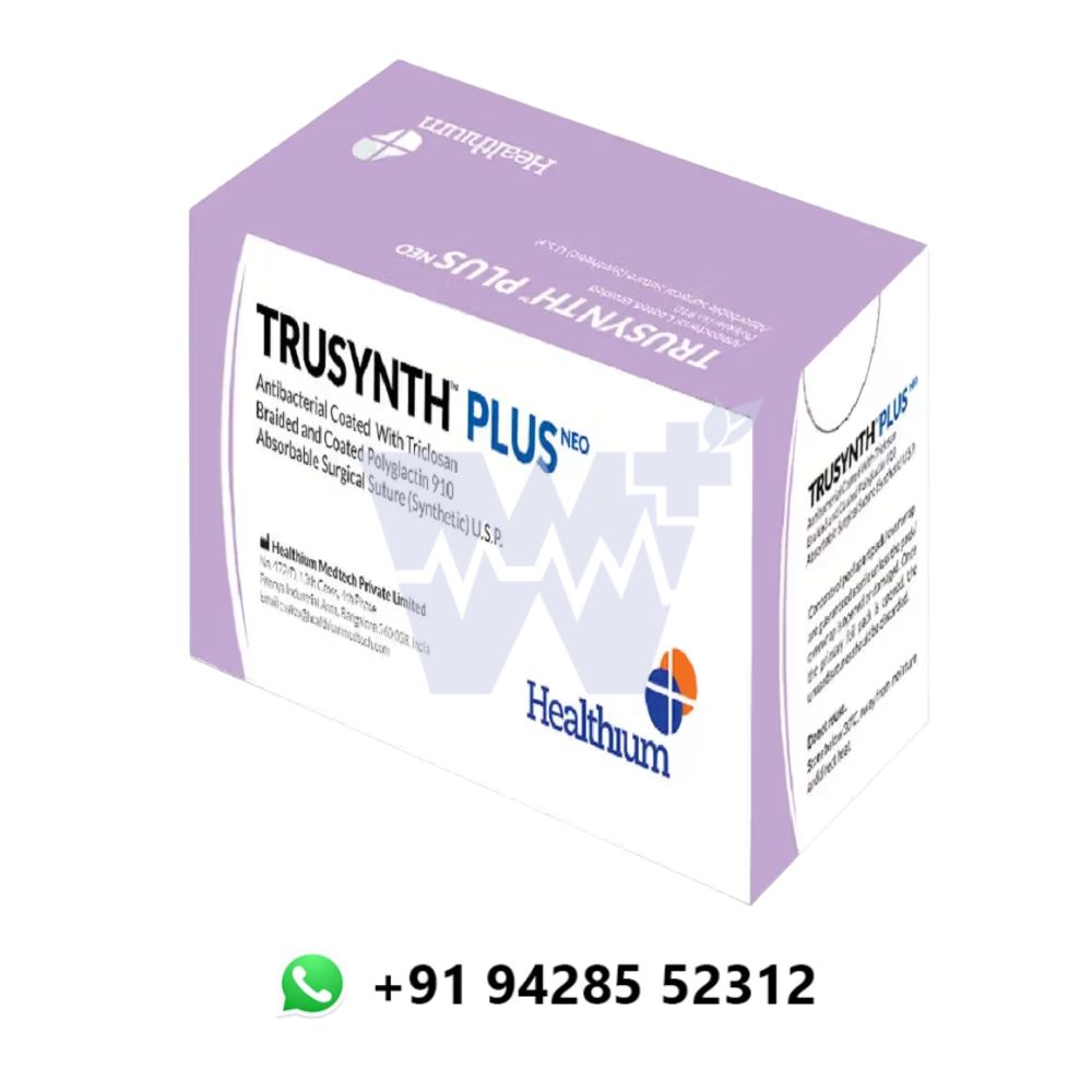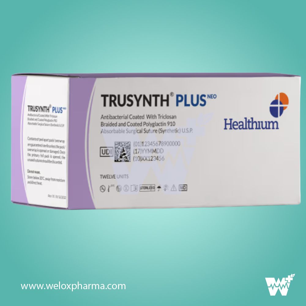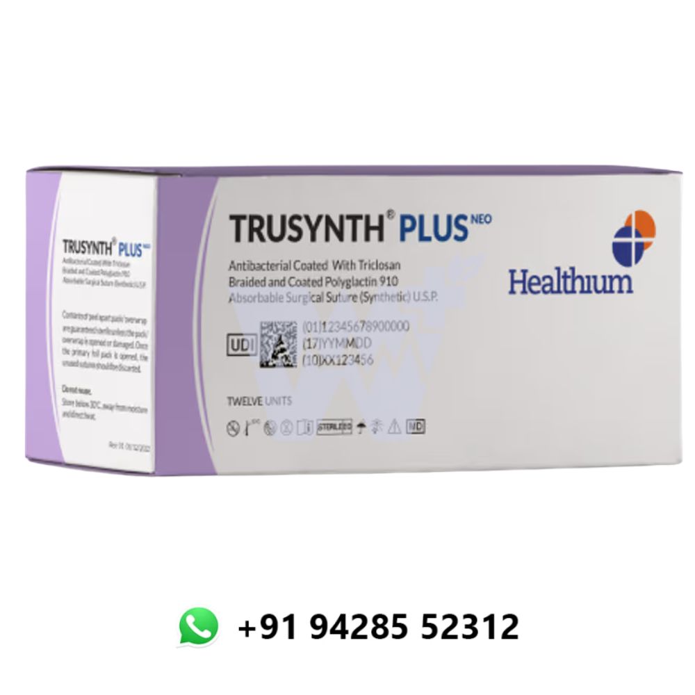 Healthium Trusynth Plus Neo Suture 1-0 is a sterile, absorbable, braided surgical suture made from polyglactin 910 and coated with triclosan to provide antimicrobial protection. Designed for soft tissue approximation, it offers superior handling, reliable knot security, and reduces the risk of surgical site infections. Ideal for use in general, gynecological, and pediatric surgeries, it ensures effective wound support during the critical healing phase.