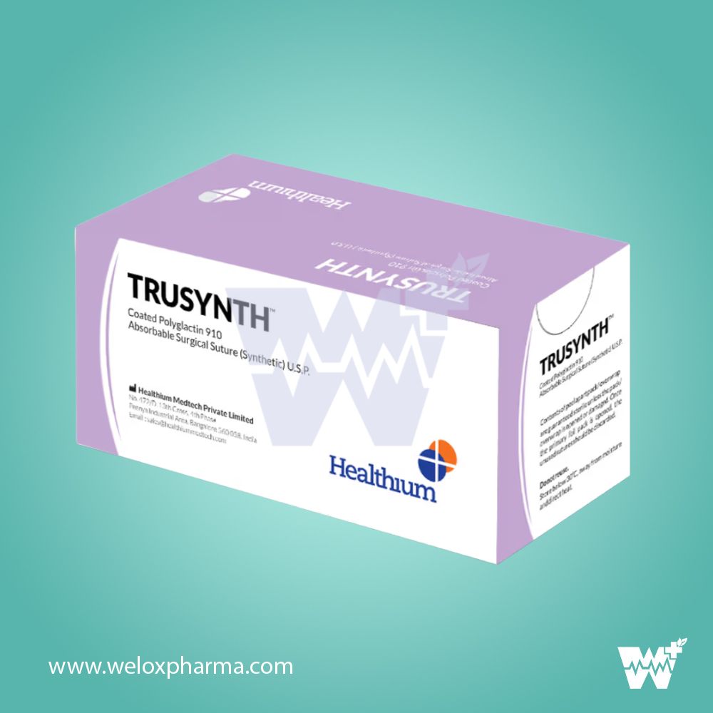 Healthium Trusynth is a synthetic, absorbable surgical suture made from Polyglactin 910, widely used for soft tissue approximation across various specialties. It provides reliable wound support for up to 28 days and is fully absorbed via hydrolysis within 60–70 days—faster than conventional polyglycolic acid sutures. Designed for optimal intraoperative performance, Trusynth ensures minimal tissue reactivity, excellent tensile strength, and superior handling characteristics.