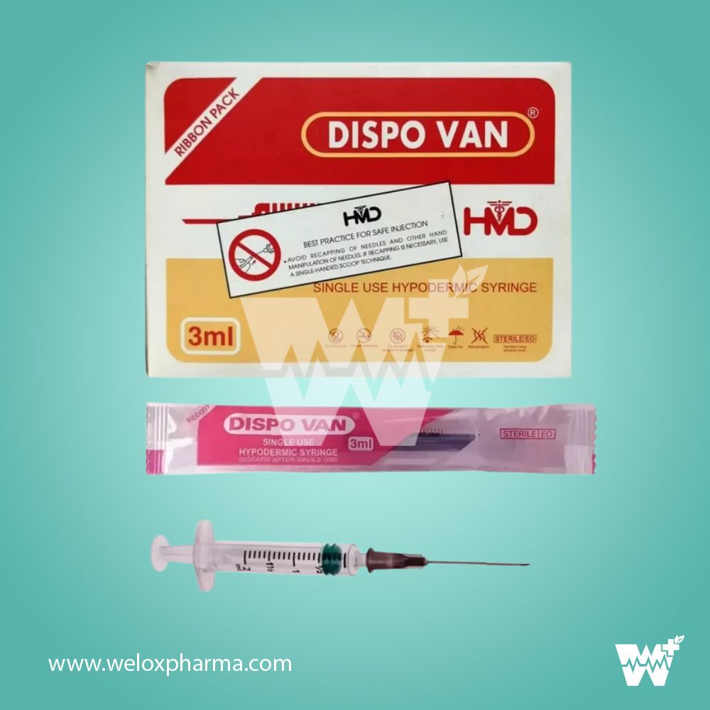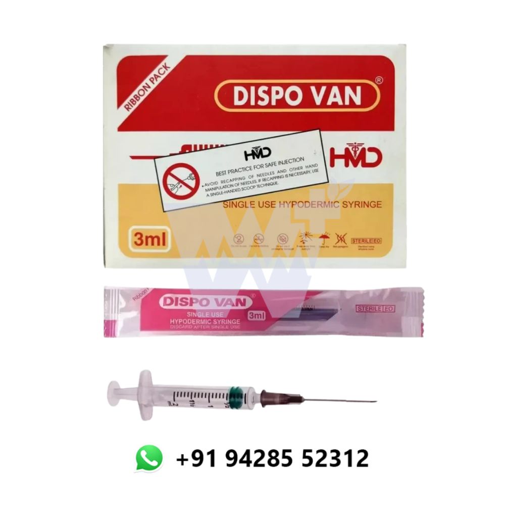 HMD DispoVan 3ml syringe with needle is a high-quality, single-use medical device used for administering injections or drawing fluids. Manufactured from medical-grade polypropylene, it ensures precision and safe usage. The syringe is EO sterilized and individually packed to maintain hygiene and prevent cross-contamination.