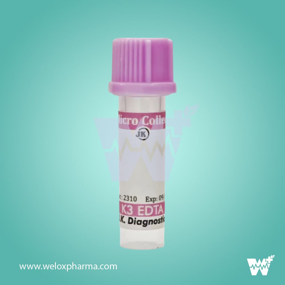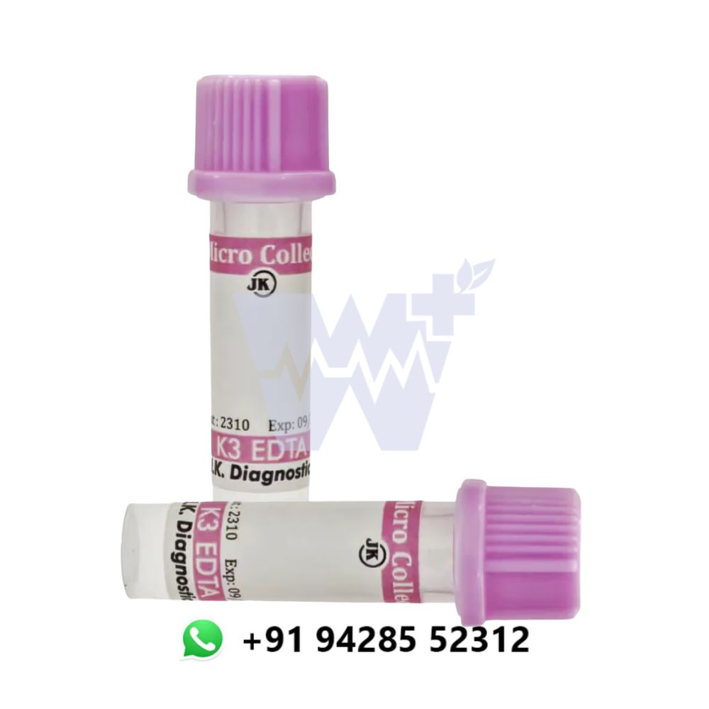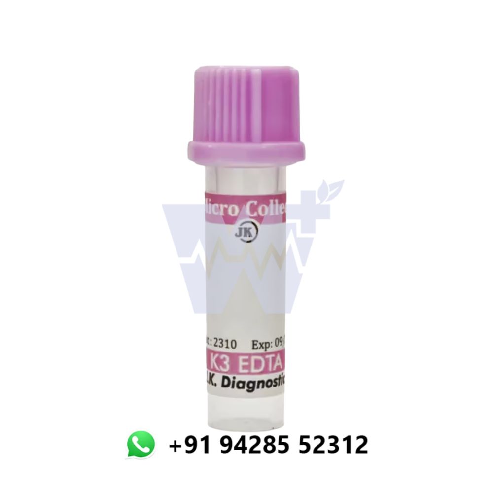 The J.K. Diagnostics Paediatric K3 EDTA 0.5ml Blood Collection Tube is specially designed for pediatric and low-volume blood sampling. Pre-loaded with liquid K3 EDTA, it provides effective anticoagulation by chelating calcium ions, ensuring accurate hematological analysis with minimal sample volume. Ideal for neonatal and pediatric patients, this tube maintains cellular integrity and prevents clotting, making it suitable for complete blood counts (CBC) and related tests. Its compact, high-quality design ensures safe, reliable performance in sensitive clinical settings.