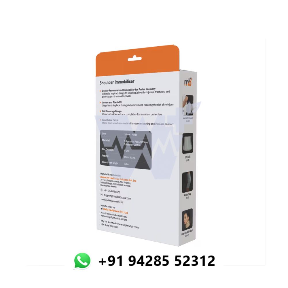 The MB+ Malu Shoulder Immobilizer is designed to provide optimal support and immobilization for individuals recovering from shoulder surgeries, dislocations, or injuries. It helps restrict shoulder movement to facilitate healing while ensuring comfort during extended wear. The lightweight, breathable material offers excellent durability and minimizes irritation. Featuring adjustable straps, it provides a secure, customized fit for various body sizes, making it suitable for all-day use. Whether recovering from rotator cuff surgery, fractures, or soft tissue injuries, the MB+ Malu Shoulder Immobilizer ensures effective immobilization and stability throughout the healing process.