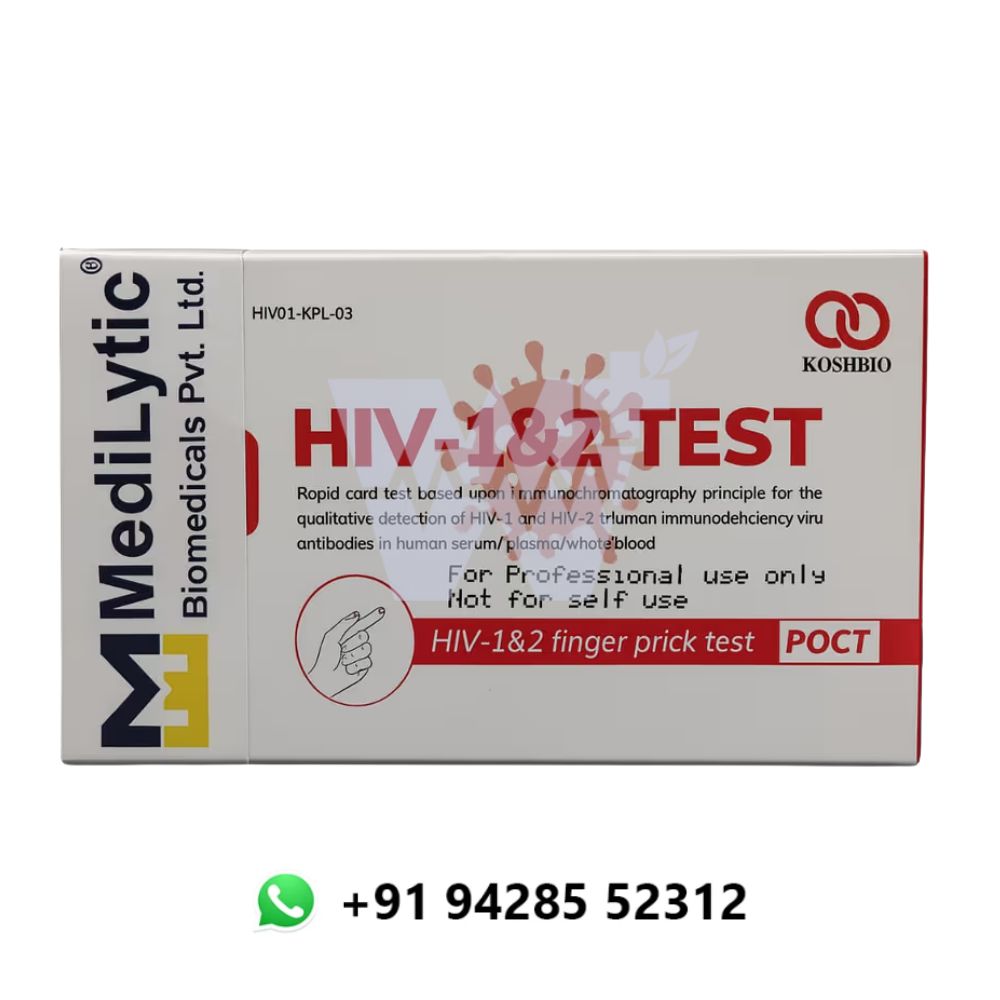The Medilytic Biomedicals Koshbio HIV-1&2 Rapid Card is a reliable and fast diagnostic tool designed for the simultaneous detection of HIV-1 and HIV-2 antibodies in human serum, plasma, or whole blood. This easy-to-use, point-of-care test delivers results in just 15 minutes, offering healthcare professionals a rapid, accurate method for HIV screening. The test is suitable for use in clinics, hospitals, and field settings, enabling timely detection and intervention for individuals at risk of HIV infection.