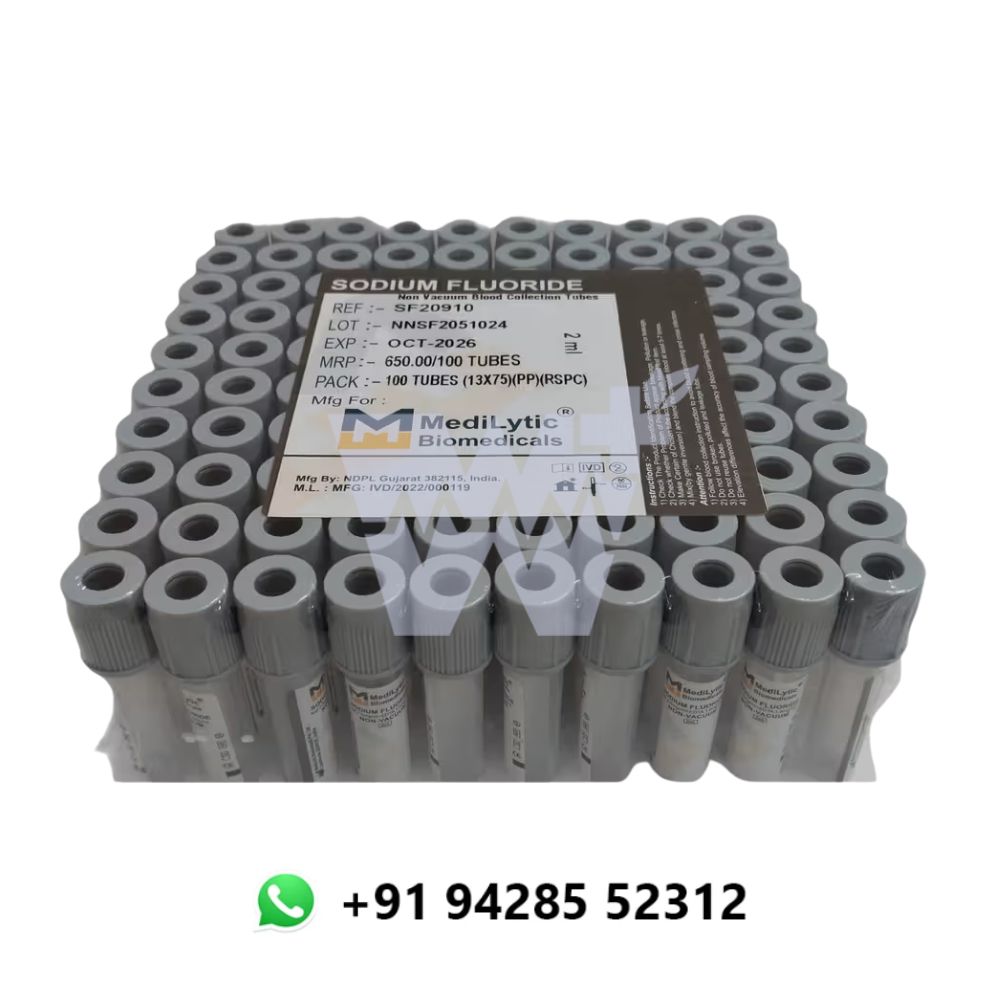 The Medilytic Biomedicals Sodium Fluoride Non-Vacuum Blood Collection Tube (2ml) is designed for precise glucose testing and biochemical analysis. Pre-filled with sodium fluoride, a proven antiglycolytic agent, it effectively preserves glucose stability by inhibiting glycolysis during sample storage and transport. The non-vacuum design offers manual collection flexibility, especially beneficial in sensitive or low-volume settings. Each sterile tube is manufactured from durable, medical-grade plastic to ensure sample integrity and minimize breakage risk. Ideal for laboratories and clinical environments, these tubes come in packs of 100 for reliable supply and workflow efficiency.