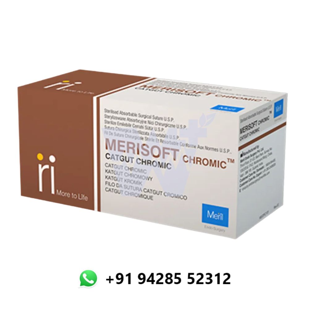 Meril Merisoft Chromic Catgut Suture is a sterile, absorbable surgical suture prepared from purified collagen (primarily collagen) derived from sheep intestine. Treated with chromium salts, it offers prolonged wound support and delayed absorption, making it particularly suited for general soft-tissue approximation and ligation procedures. Featuring high collagen content and a refined surface finish, Merisoft Chromic provides reliable handling characteristics, secure knot performance, and predictable absorption. The brown‑dyed suture ensures visibility during placement in diverse surgical settings.