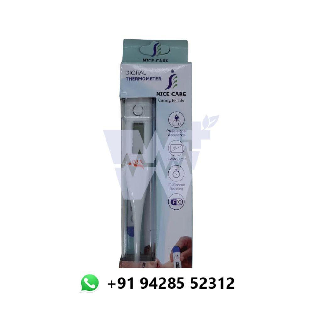 The Nice Care Digital Thermometer provides quick and accurate temperature readings, making it ideal for both clinical and home use. Its soft, flexible tip ensures comfort, particularly for children and infants, while delivering precise measurements. The easy-to-read digital display shows temperatures in both Celsius and Fahrenheit, allowing for versatility across different age groups. Suitable for oral, rectal, and axillary (underarm) temperature readings, the Nice Care thermometer is designed for quick results and reliable performance. Its waterproof design ensures easy cleaning, making it a hygienic and durable choice for everyday temperature monitoring.