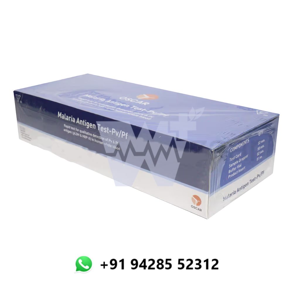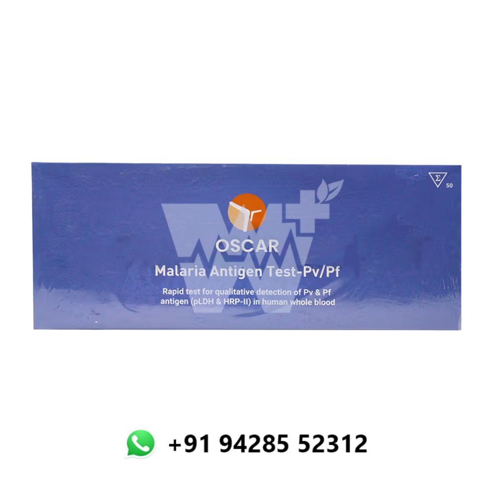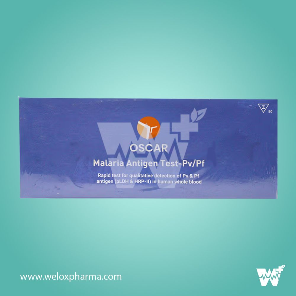 The Oscar PV/PF Malaria Rapid Card is a lateral flow immunoassay designed for the qualitative detection and differentiation of Plasmodium vivax (Pv) and Plasmodium falciparum (Pf) antigens in human whole blood. Developed for point-of-care use, this rapid diagnostic test delivers fast, reliable results to support early malaria diagnosis and species-specific treatment. Each kit contains 25 individually sealed test devices, ideal for both clinical and field applications.