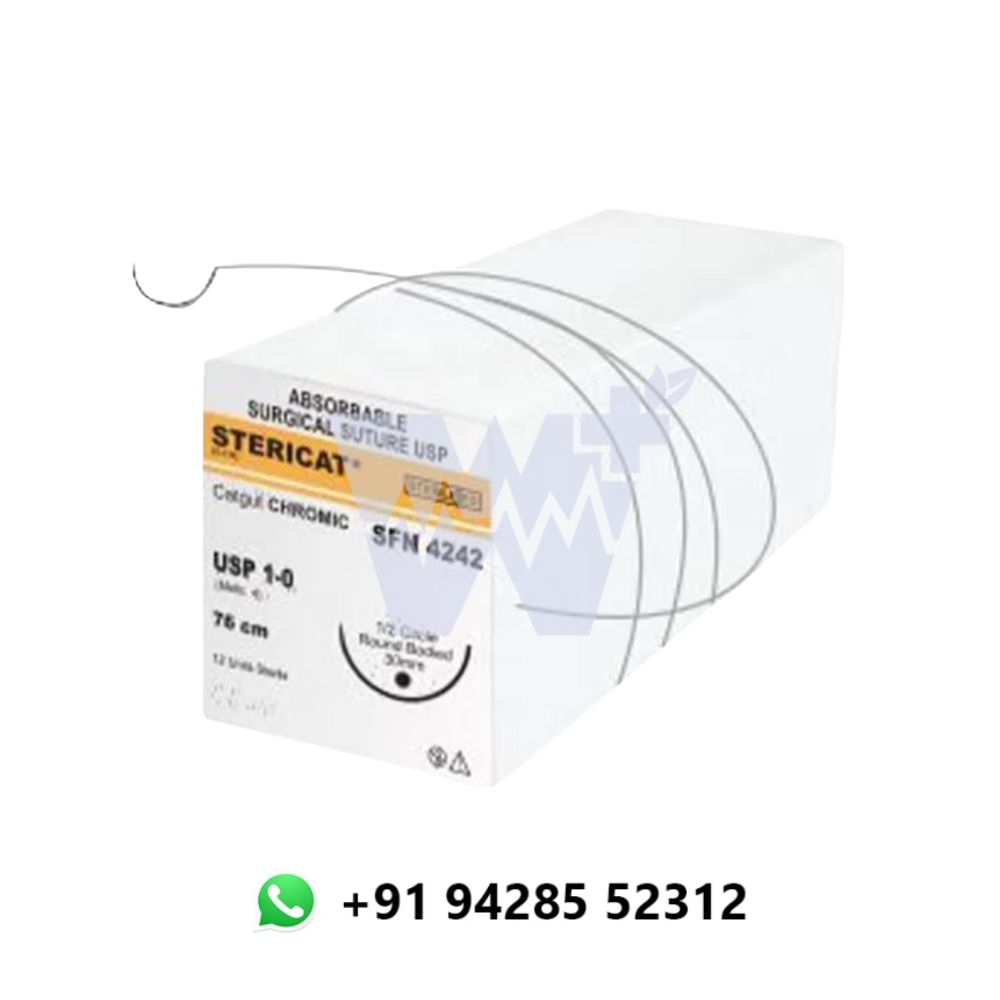Peters Surgical Stericat Catgut Chromic is an absorbable, natural suture made from purified connective tissue (mostly collagen) derived from healthy bovine intestines. Treated with chromic salts, it offers prolonged absorption time and reduced tissue reactivity. It is indicated for soft tissue approximation, including ophthalmic and general surgical procedures, but not for cardiovascular or neurological use. The suture elicits a mild tissue reaction followed by enzymatic absorption, typically complete within 90 days.