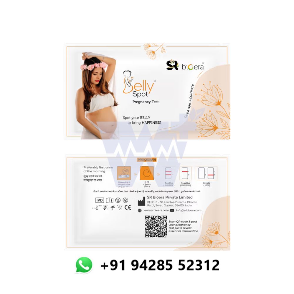 The SR Bioera Belly Spot Pregnancy Kit is a fast, reliable, and easy-to-use diagnostic tool designed to detect human chorionic gonadotropin (hCG) in urine, a key hormone indicative of pregnancy. This rapid test provides individuals and healthcare professionals with an accurate method to confirm pregnancy early, offering convenience and efficiency in both home and clinical settings.